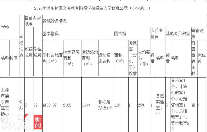 记者查询浦东新区教育局官网4月发布的《2025年浦东新区义务教育阶段学校招生入学信息公示》发现,浦东新区三桥小学目前办学规模一栏中确实标注:班级总数5个,学生总数22人,专职教师23人,师生比1.0。记者注意到,上海市浦东新区三桥小学微信公众号4月8日发布的2025年招生告示显示,2025年该校计划招收一年级新生1个班。