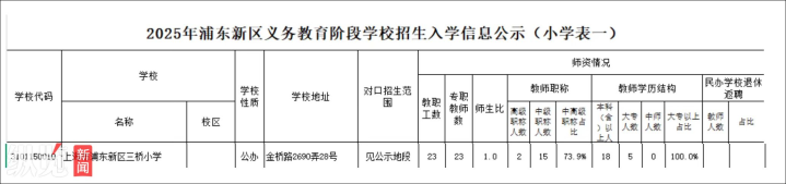 2025年浦东新区义务教育阶段学生招生入学信息公示显示该校专职教师为23人。(来源/浦东新区教育局官网)